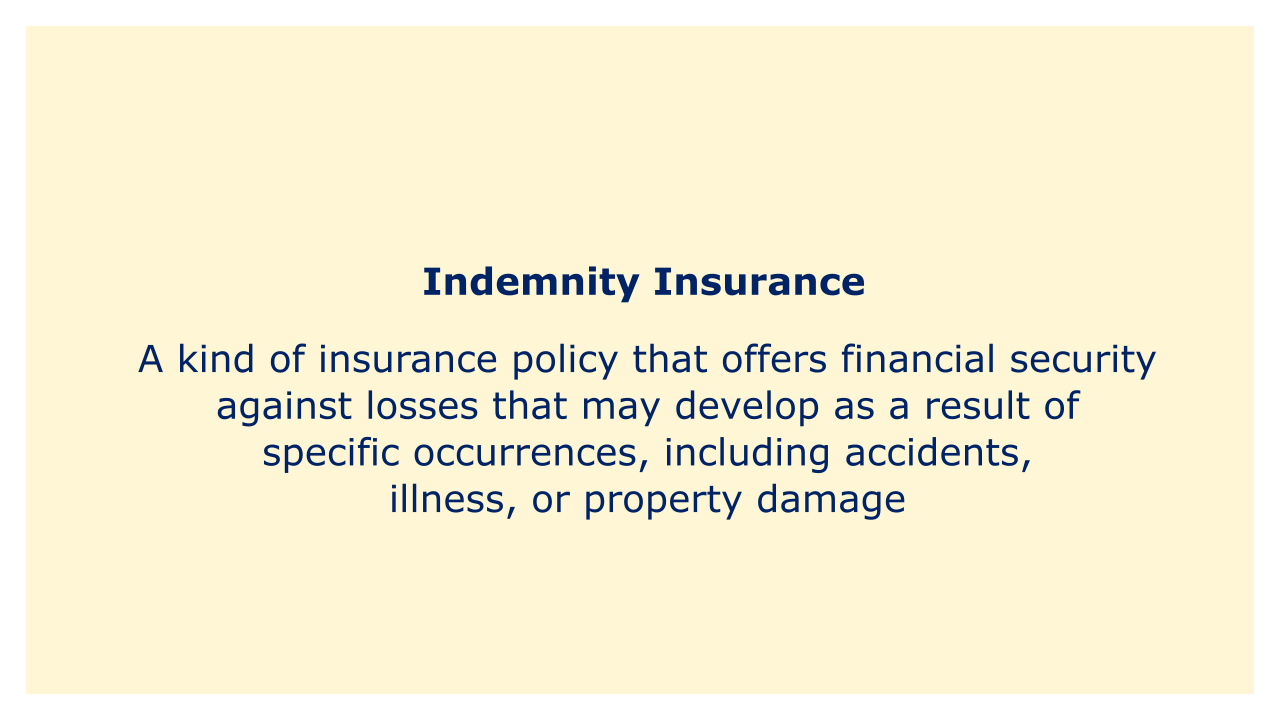 Indemnity insurance is a kind of insurance policy that offers financial security against losses that may develop as a result of specific occurrences, including accidents, illness, or property damage. In the case of indemnity insurance, the insurer promises to pay the policyholder back for any damages covered by the contract, up to the policy's maximum.