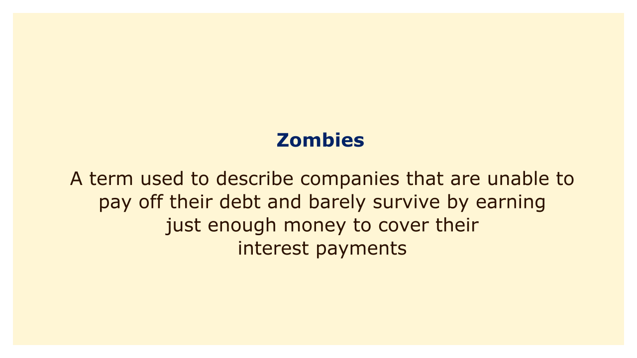 Zombies are a word used to characterize businesses that are unable to repay their debt and are only able to make enough money to pay their interest. These businesses frequently lack efficiency and profitability and are reliant on low-cost loans from banks or governments.